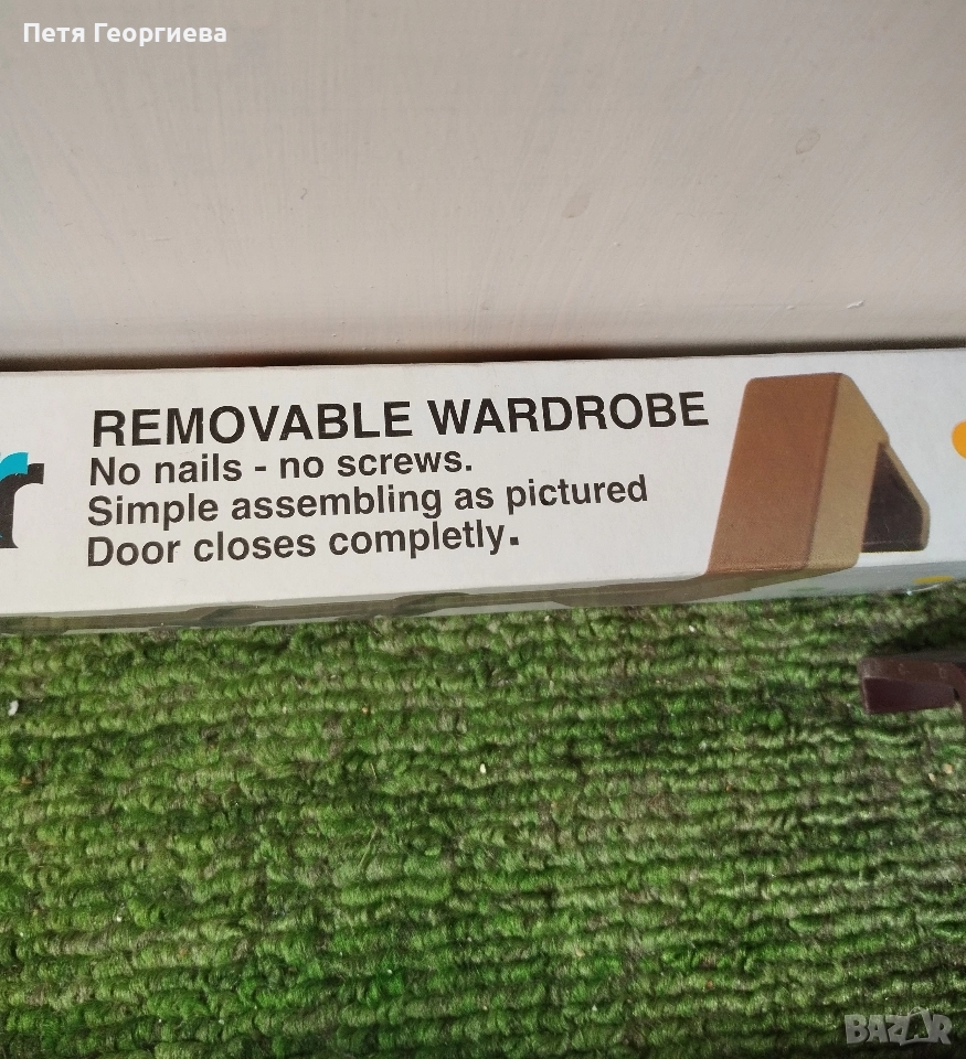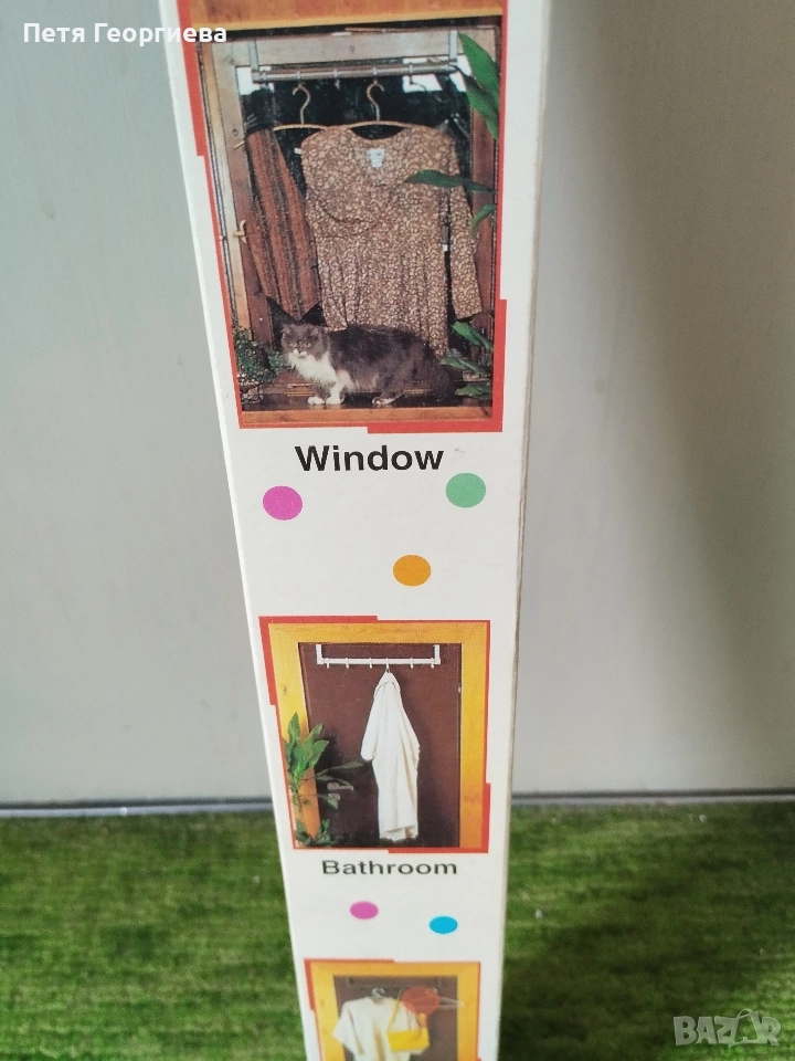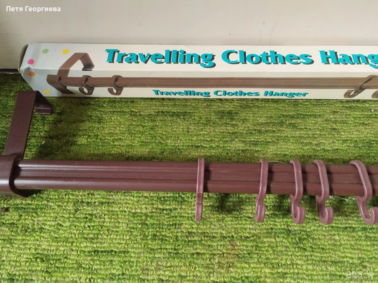 Закачалка за дрехи "Removable wardrobe" (Подвижен гардероб), за която не са нужни пирони и винтове. Много е удобна при пътуване защото лесно може да се окачва на врата, прозорец, в баня и други места. Дължина на закачалката 59 см, а на страничните куки 12, 5 см. Нова, в оригиналната кутия.