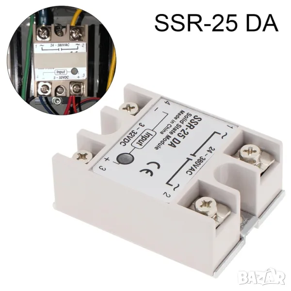 - SSR-25 DA е еднофазно полупроводниково реле, което използва DC контролиран променлив ток, с управляващо напрежение DC 3-32V, напрежение на натоварване 24-380VAC и ток на натоварване 25A. Той се използва широко в устройства за автоматизирано управление като трансформатор, претоварване на предавателни линии, двигатели и защита от късо съединение.