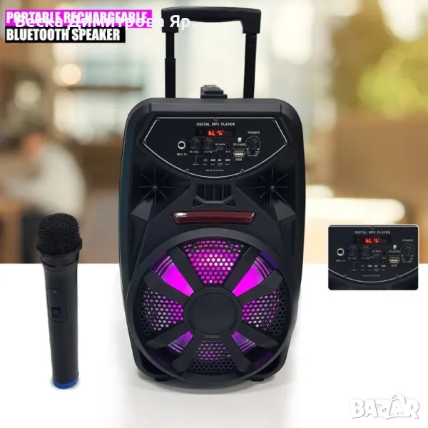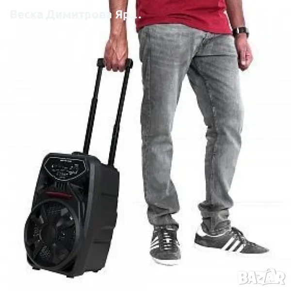 Преносим Bluetooth високоговорител с вход за микрофон PK-09(L);Тонколона PK-09L с вграден усилвател, FM тунер, 1 безжичен микрофон и Li-ion акумулаторна батерия, възможност за запис на USB флаш. Възпроизвежда MP3, FLAC файлове от TF CARD и USB FLASH DRIVE. Вход за допълнителен микрофон с EXO ефект и регулировка на усилването, линеен стерео 3.5mm AUX вход, Bluetooth. Disco Light. Диаметър на нискочестотния говорител 8". Зареждане на батерията с кабел micro USB букса към USB порт 5V. Захранване на микрофона с 2 батерии тип R6 AA. Дистанционно управление, отвор за монтаж на стойка. Размери 250x230x400mm.Изходна мощност 300W;Честоти от 20 Hz до 20 KHz;Акумулаторна батерия 3.7v, 2200mah;8 инча говорител;Bluetooth, USB, SD/TF карта, AUX;Микрофон;Кабел за зареждане;ЛЕД дисплей;Гаранция: 12 месеца.