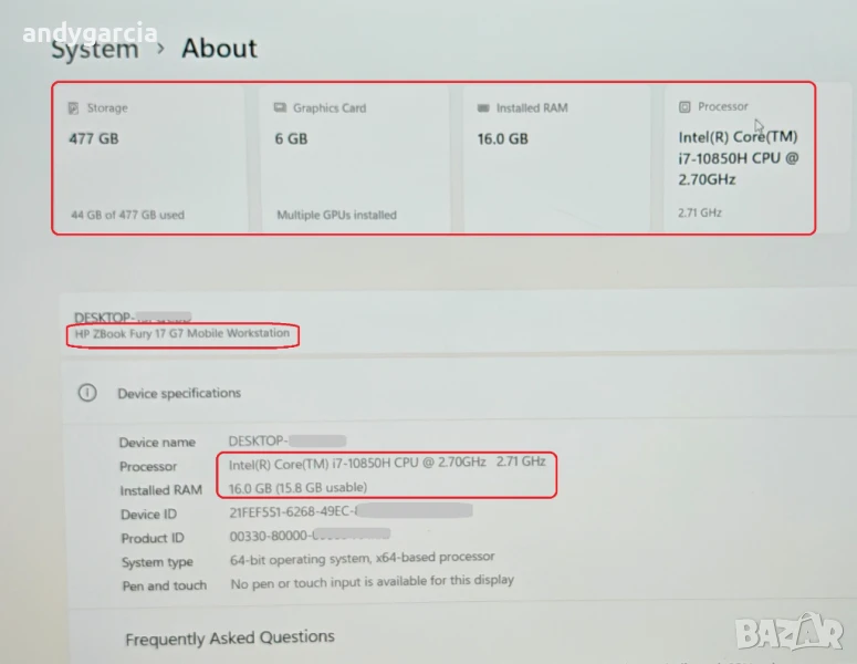 Процесор: Intel Core i7 модел 10850H (2.70 до 5.10GHz, 12Mb cache)