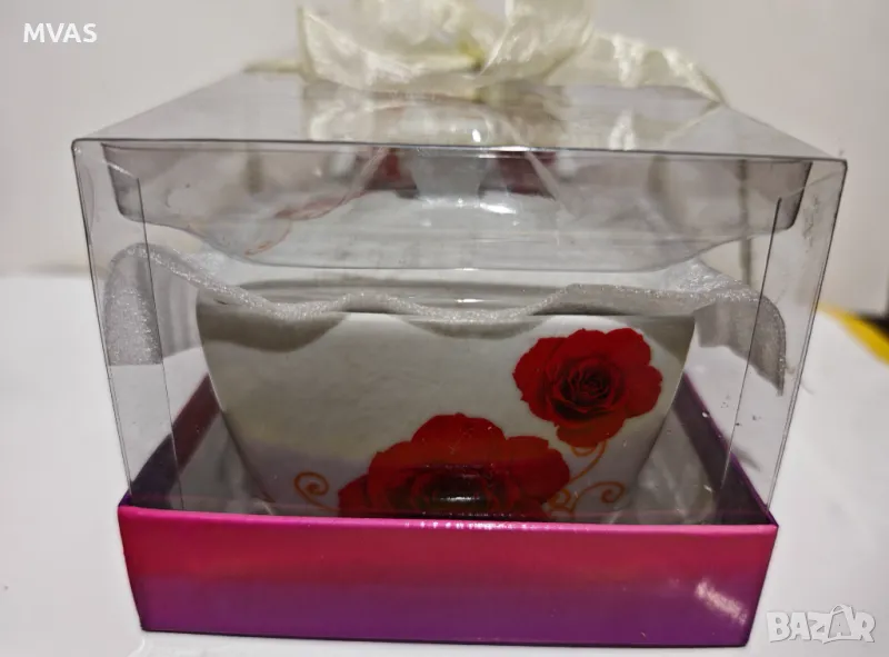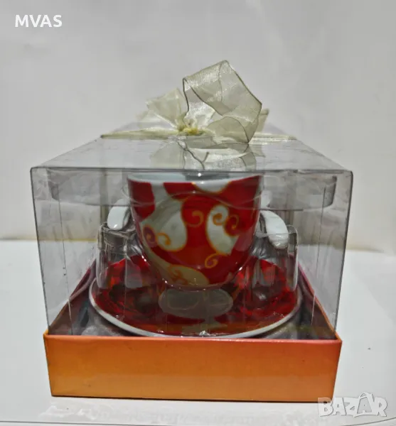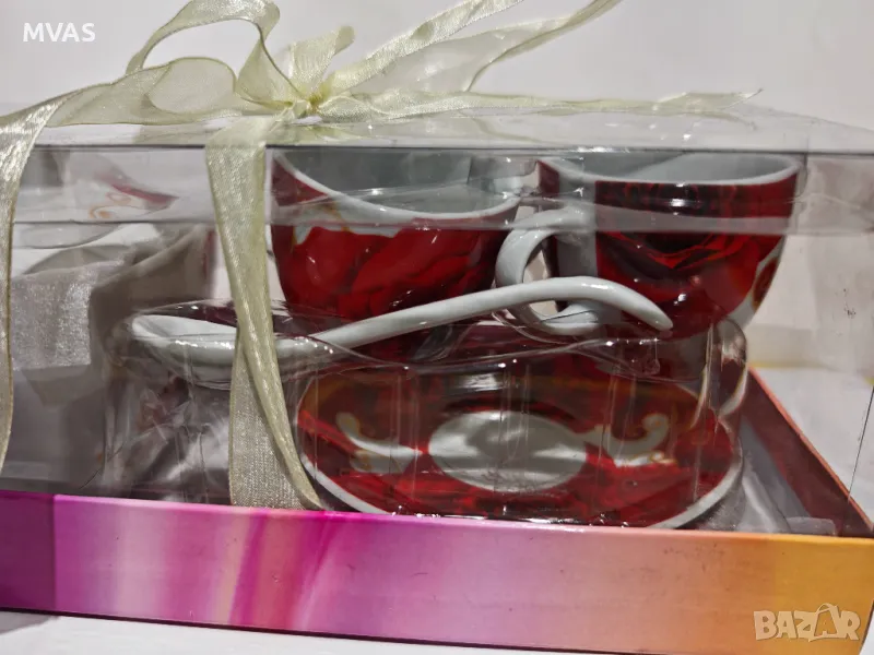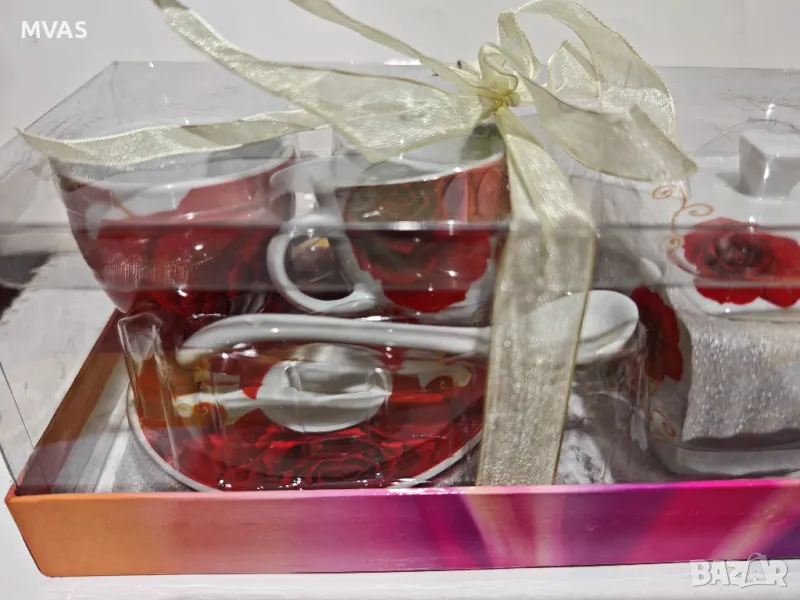 Нов сервиз за кафе за Двойка 2 чашки чинийки лъжички и захарница Червени рози Свети Валентин