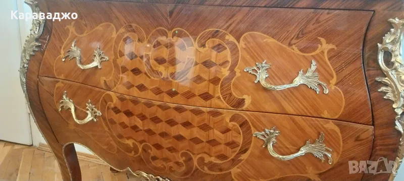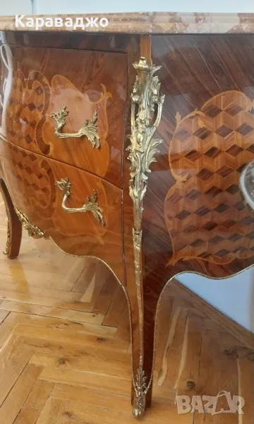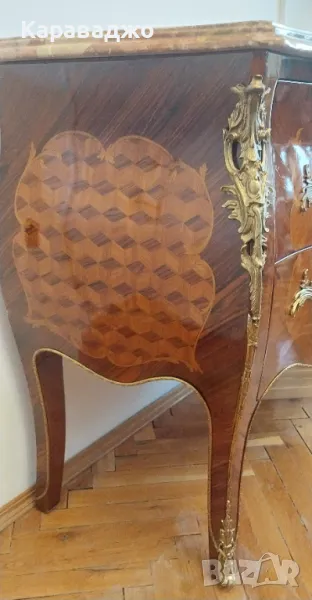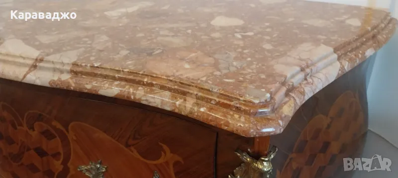 Голям луксозен комод френски/италиански.Изработка палисандър покрит с маркетри,позлатен бронзов обков,красив мраморен плот с размери 110/50см.Перфектен!
