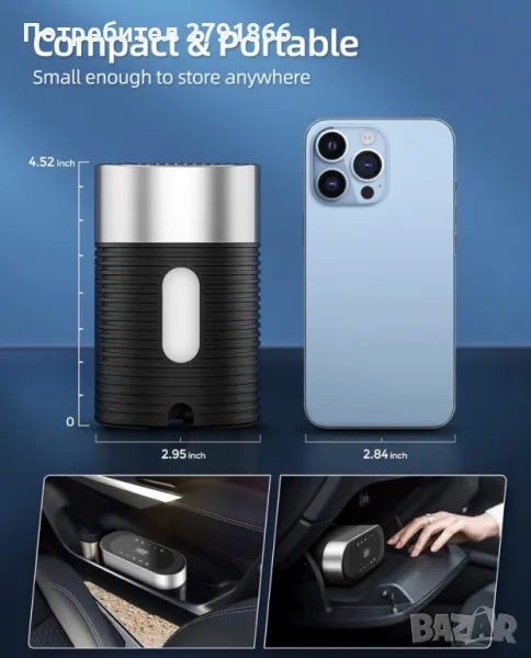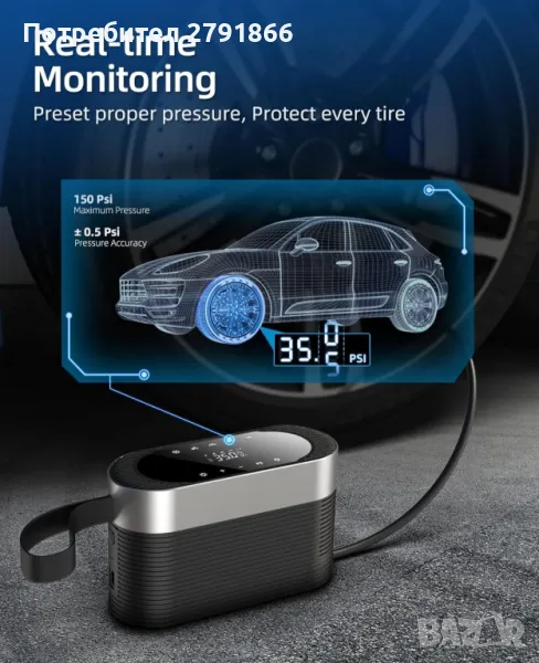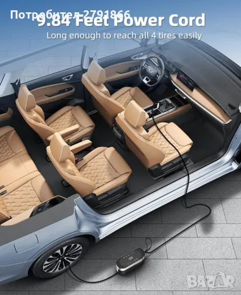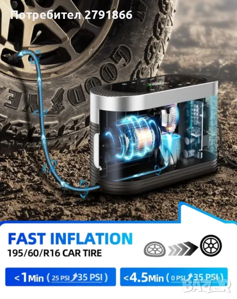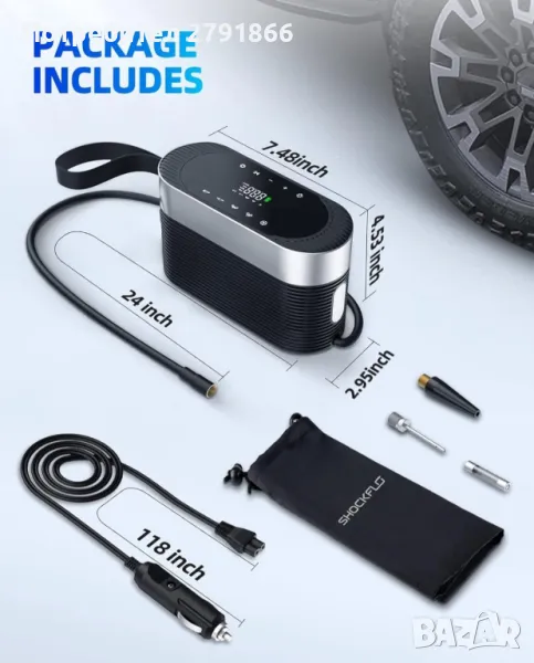 КОМПАКТЕН РАЗМЕР: Размерът на продукта е само 7,4x2,9x4,5 инча. Въздушният компресор е достатъчно компактен, за да се прибере лесно във вашата кола или гараж. Той е роден за вас и е проектиран да спести място в колата ви. В допълнение захранващият кабел от 9,84 фута е достатъчно дълъг, за да достигне лесно до четирите гуми.