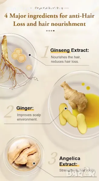 Спрей за растеж на косата с джинджифил: Напоен с екстракт от джинджифил, този спрей стимулира растежа на косата и укрепва корените.