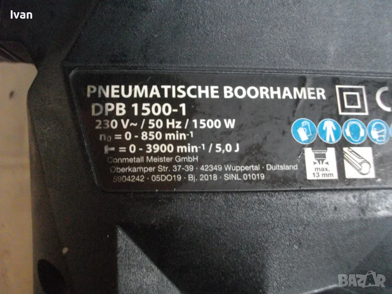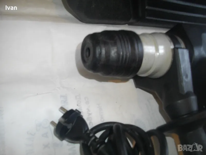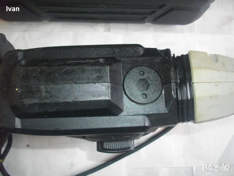 С много запазен външен вид и техн.състояние - ЗАБЕЛЕЖКА ПО ПАТРОННИКА ГЛАВА SDS Plus. Ротора много добре - няма никакво искрене на ниво четки/ротор/статор. Няма смущаващи вътр.шумове като виене, тракане, свистене, луфтове. Мощност на мотора - 1 500 вата, обороти празен ход пробиване - 0 -850 об./мин. Трептения при удар - 3 900 /мин. Сила пробив - 5,0 джаула - 5,0 J. Патронник стандартен голям SDS Plus - с макс захват 13 мм. Регулация на скоростта - 6 степени. Гумена мембрана м/у корпус и дръжка за обиране на вибрациите. Четки - външни. Наличие на оригинална гумирана, инпрегнирана, масивна, предна дръжка -оригинална немска. Наличие на дълбокомер към предната дръжка - метален стоманен, масивен. Гумирани покрития, нехлъзгащи се, на задната дръжка. Машината е прибрана в оригиналният си немски твърд пластмасов куфар, с фабричното лого, и метални копчалки.