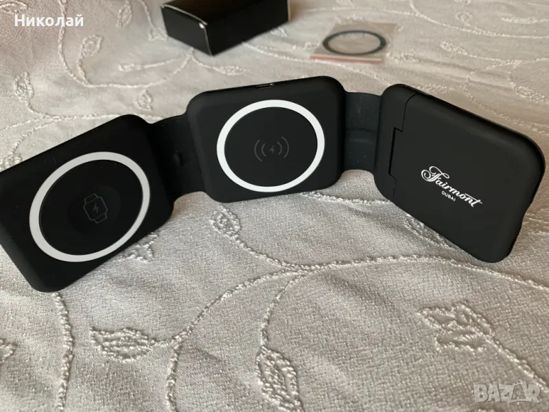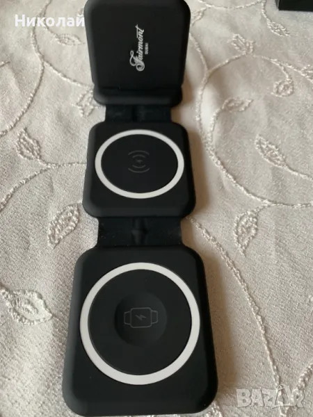 заедно, докато се зареждат. Характеристиките включват 15W магнитна подложка за