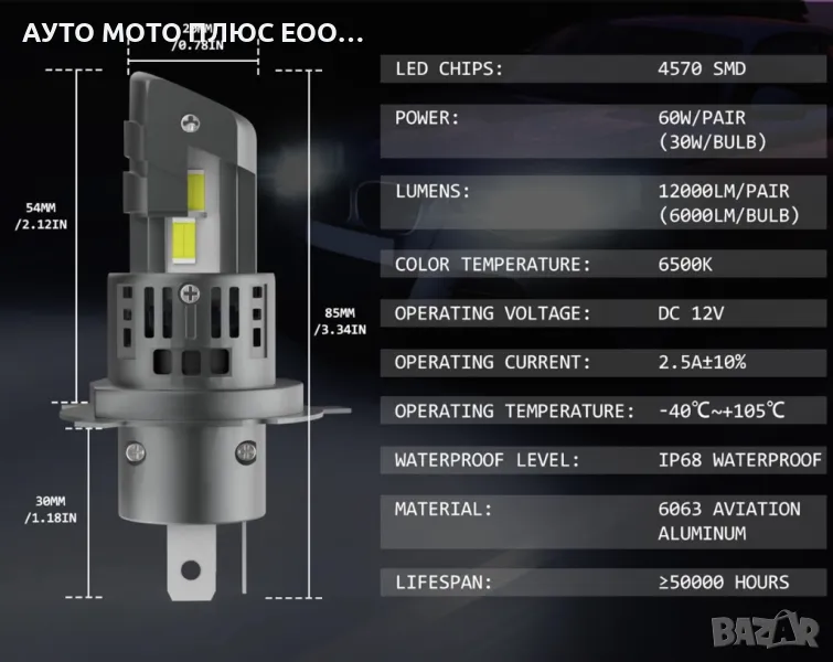 Мини Модел 60W LED Диодни крушки H4 12V за бърз директен монтаж.