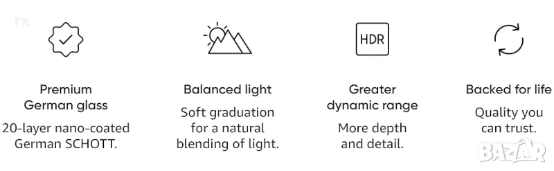 Изработен с немско стъкло SCHOTT за истинска пропускливост на светлина и изключителна острота на изображението.