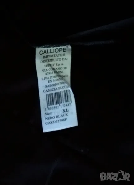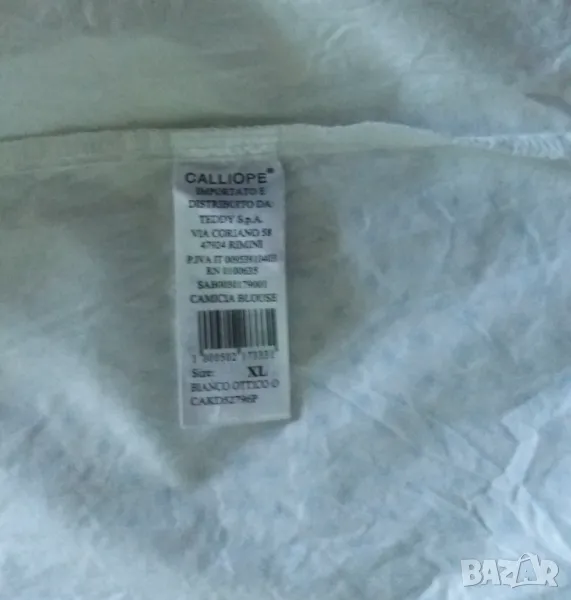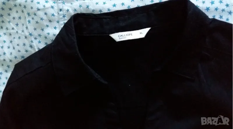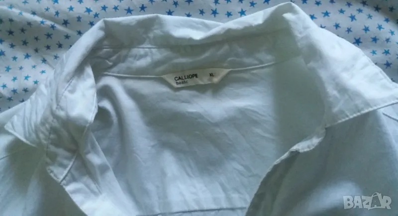 Класическа обикновена памучна дамска риза Calliope размер XL. По скоро отговаря на размер L. Не се разтяга. Класическа яка и закопчаване с копчета. Налични една в бяло и една в черно. Дължина 71 см, ширина подмишниците приблизително 48 см, ширина на талията 44 см.