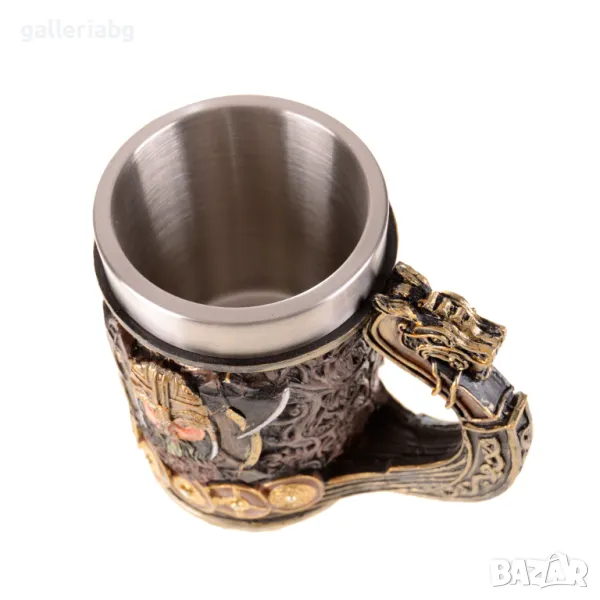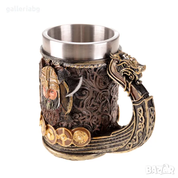 Стилна викингска чаша Valhalla с релефна фигура на викинг воин и детайлни орнаменти по цялата повърхност. Дръжката е оформена като дракар (викингски кораб), което я прави много ефектна на бюро, рафт или бар плот.