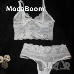 Комплект "Virgin" - дантелен топ с дълбока бикина или прашка по избор Модела е изключително подходящ за дами с пищни форми. Изработва се в Бяло, Черно и тъмно синя дантела с черен тюл. Размери на горна част от XS до XXL, размер на долна част от XS до 4XL. Изработка и доставка до 3 работни дни.