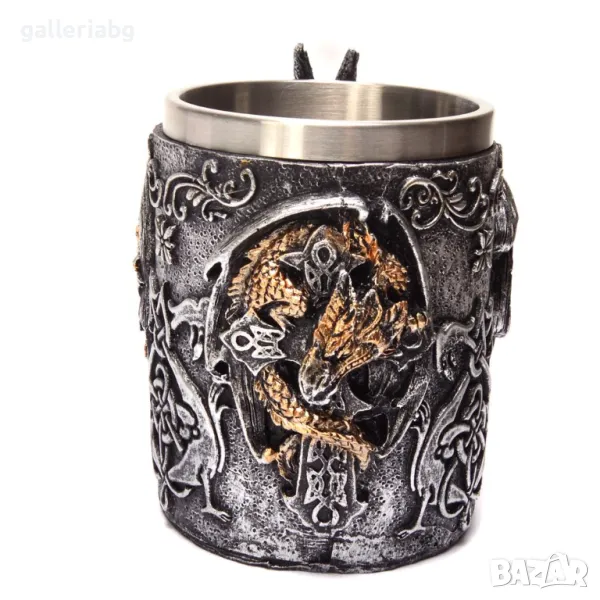Стилна чаша от полирезин и метал с релефни декорации - дракон, кръст и символи. Размери: 12.5х15 см.