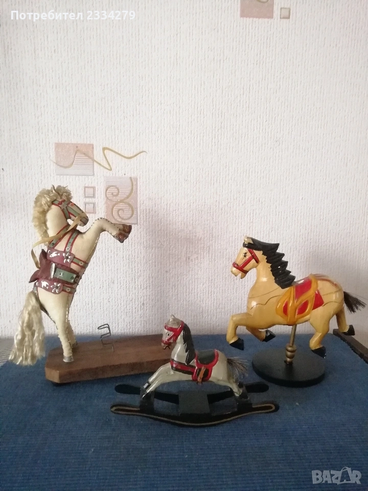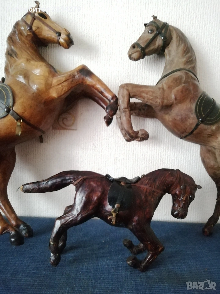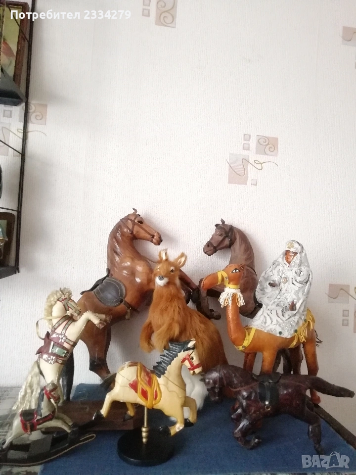 Стари кожени статуи на коне, ръчна изработка от различни автори и различни държави. N:1 голям кон от светла кожа,ръчно изработен в Швейцария с размери: 38х25х12см., цена 20€.; N:2 кожен кон тъмна кожа ръчно изработен в Швейцария, с размери: 37х23х10см., цена 13€.; N:3 конче от кожа с размери : 25х14х7см., цена 7€.; N:4 Ръчно изработен кон с поставка за книжки, шит от кожа с размери: 22х12х5см., цена 5€.; N:5 фигура на валаби кенгуру и Джон, реалистична фигура, скулптура от истинска кожа, австралийски сувенир с височина 30х25см., цена 13€.; N:6 ръчно изработена изцяло от кожа ,,камила яздена от арабска жена", рисувана и шита от естествена кожа цена 10€.; N:7 дървени кончета две играчки ръчно изработени-