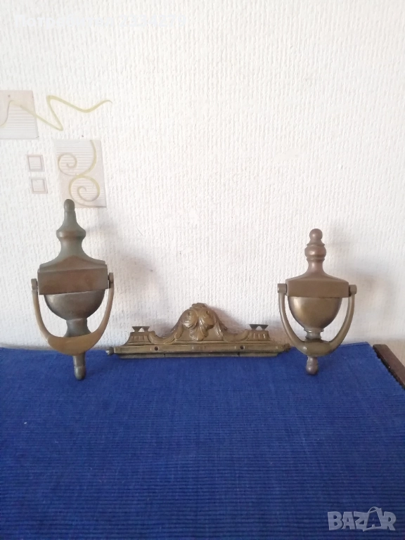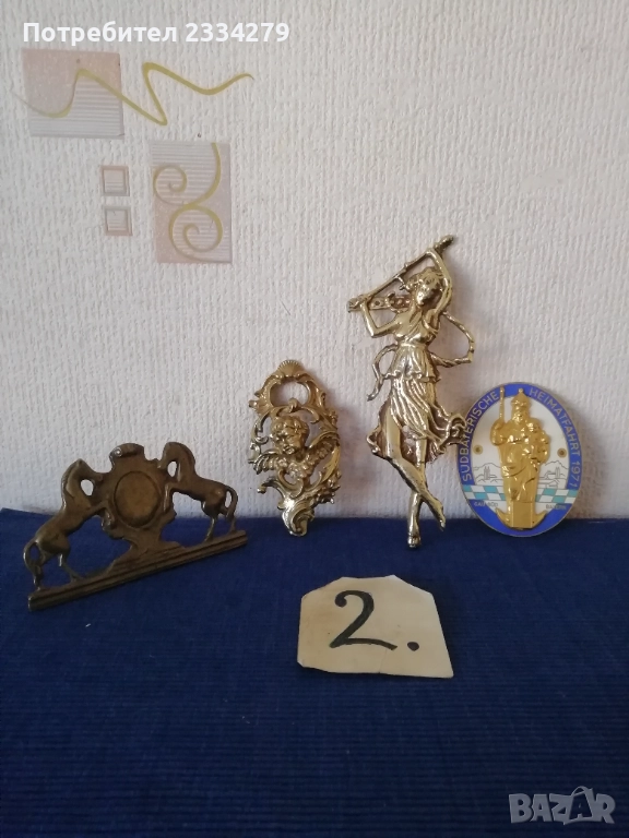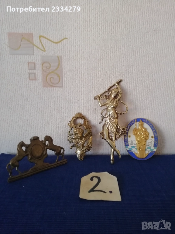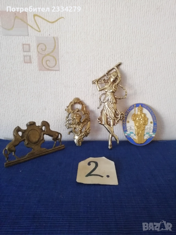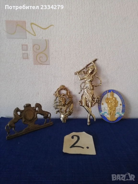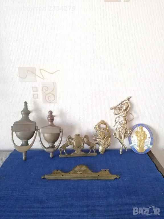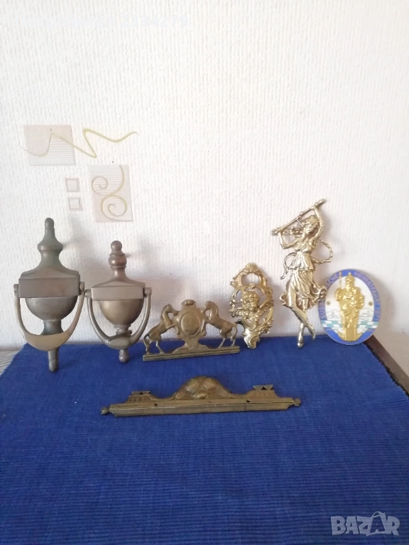 N:1 Красиви масивни бронзови орнаментирани чукала, хлопала за врати, цена 10€ брой. Бронзов мебелен обков с флорален мотив, стара бронзова апликация, цена 8€. N:2 стара бронзова отливка на коне, използвани за надстройка на часовници и други мебели, масивен бронз, цена 10€. Стар АРТ орнамент от масивен бронз, отливка на херувими, цена 10€. Отливка стил Арт Нуво, римска муза,,Танцьорка", цена 3€. Рядка находка ЕМБЛЕМА триизмерна, винтидж емблема за автомобил ,, МАДОНА БАВАРИЯ", ADAC MARINA BADGE 1971год. МЕRCEDES BENZ, PORSCHE 911, VW, BMW Германия цена 35€.