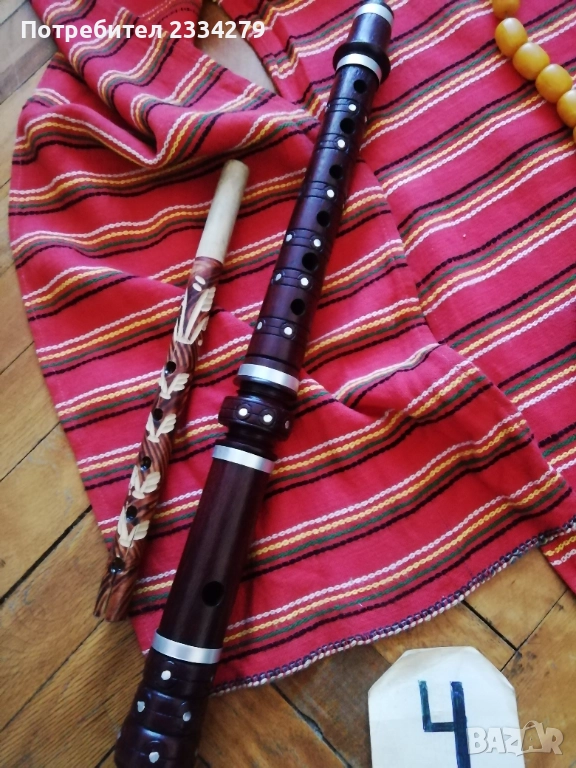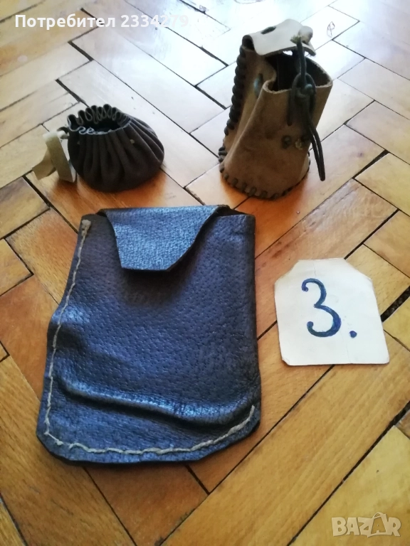 цена 25€. за брой, комплект. Кожена пунгия, възрожденско портмоне от телешка кожа за пари, тютюн и други, размери 19х14см.,цена 7€.; N:5 две дървени свирки, дърворезба, малката пищялка е върбова с дължина 25см., цена 5€., голяматам с дължина 45см., цена 10€.