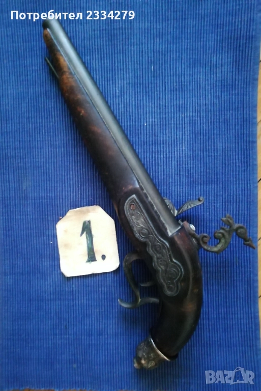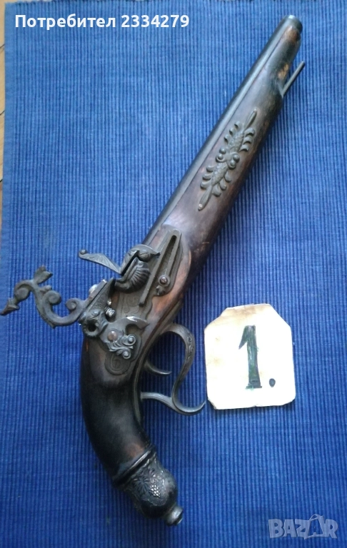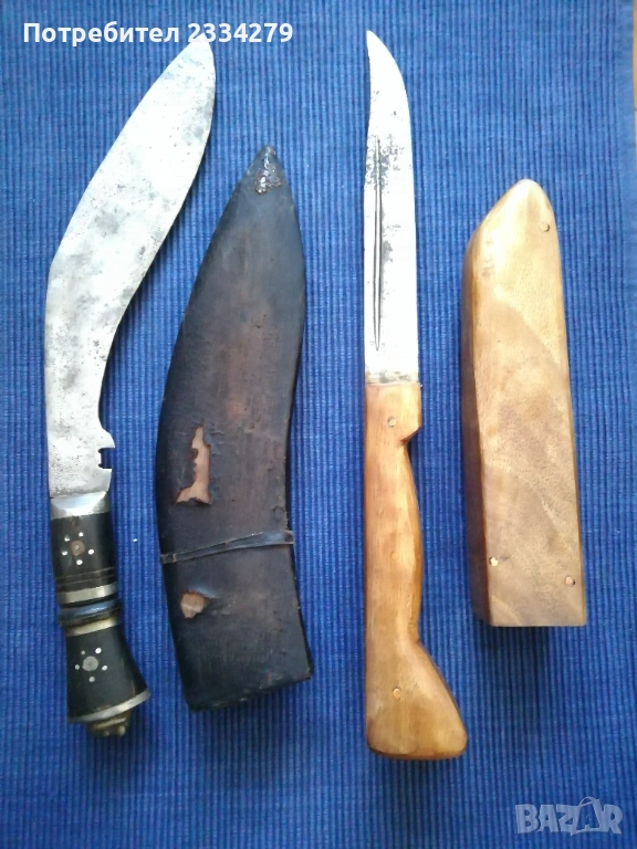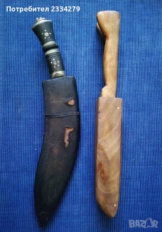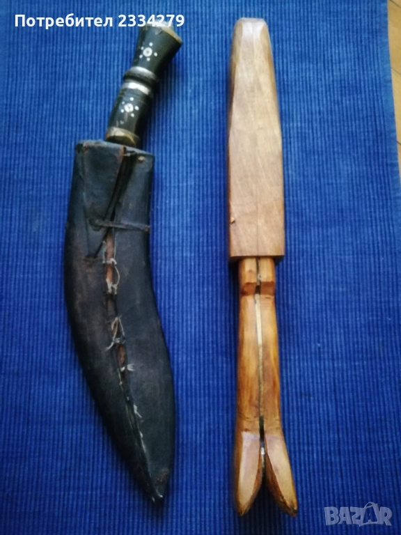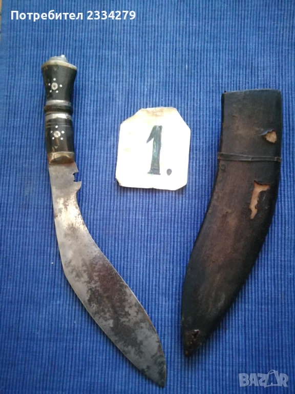 N:1 стар нож арабско кукри с наковани орнаменти по острието и кокалена дръжка, канията е от дърво и шита кожа, размери на острието дължина 23см., широчина 4.5см., дебелина 5-6мм., цена 43€. Пистолет кремаклия стара сувенирна реплика с размери по оригинал красива изработка от дърво и метал, изцяло орнаментиран, масивен, размери 38х20см.,работещ механизъм, цена 45€.; N:2 атрибути към мъжка