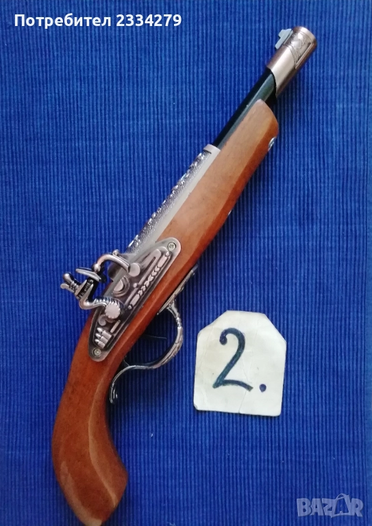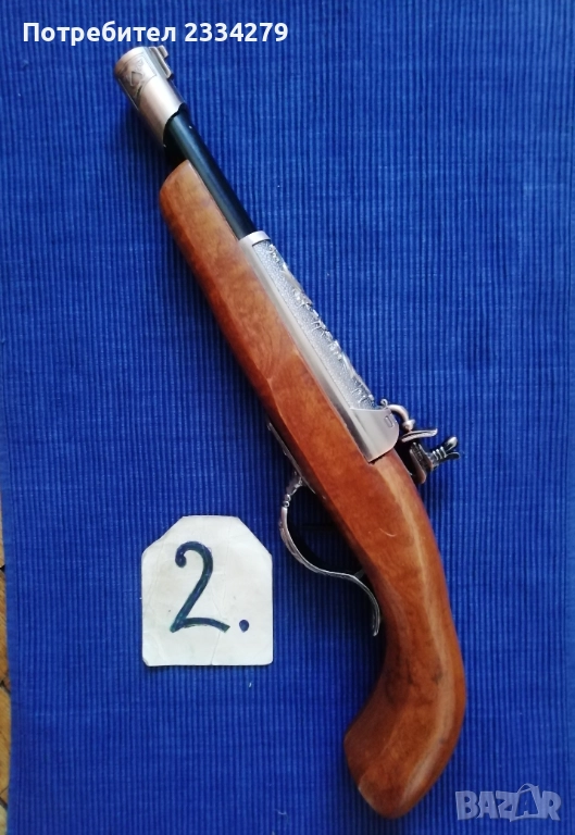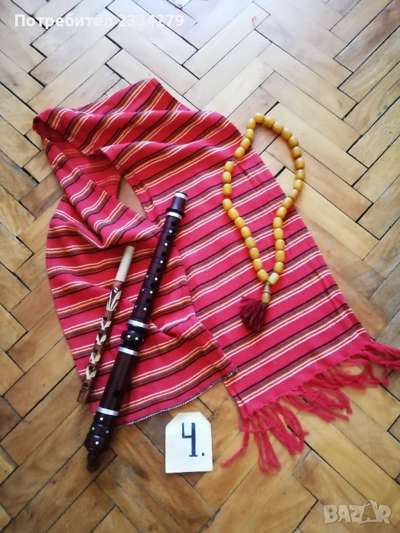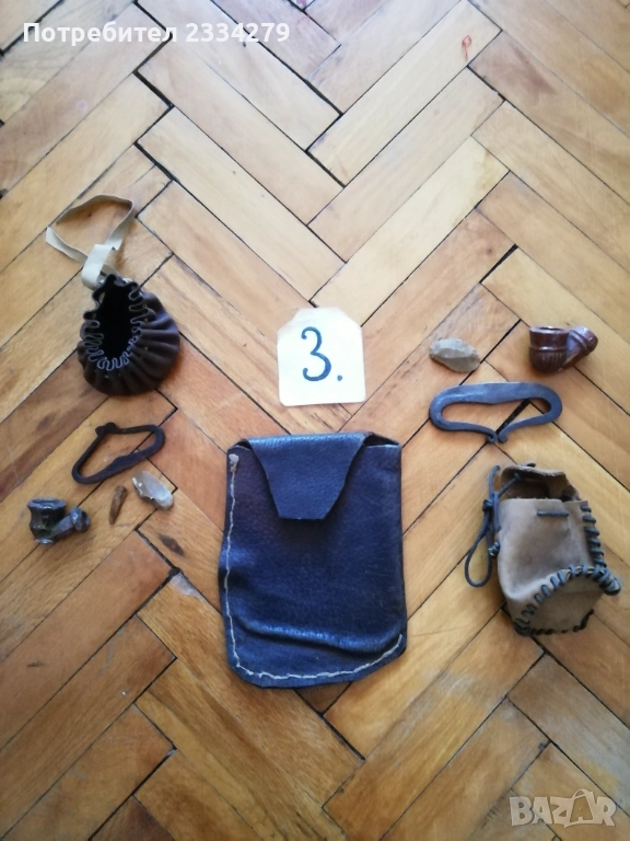 носия стар реставриран овчарски нож колак с дължина 33см.,дървена дръжка и кания, цена 30€. Реплика на кремъчен пистолет с дървена дръжка, размери 40х10см., цена 17€.; N:3 чакмаци огнива, ръчно изковани с кремък и глинени лули от османски времена, поставени в кожени торбички ,,пунгии"