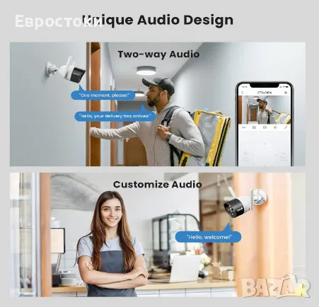 Двупосочно аудио. Идентифицирайте посетители, възпирайте натрапници и наблюдавайте членове на семейството или домашни любимци отвсякъде с комуникация на живо през камерата.