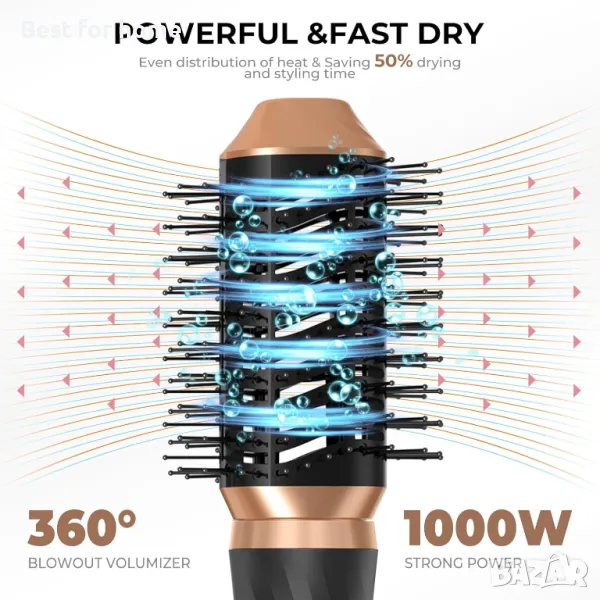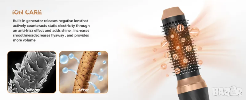 Технология с отрицателни йони и керамично покритие: Нашият комплект четки за сешоар с четка за оформяне на коса използва технология с отрицателни йони, която може да освободи отрицателни йони на 360°, издухващата четка намалява къдренето и статичното електричество, намалява щетите и в същото време по-добре поддържа косата ви; Керамичното покритие насища въздушния поток, разпределя топлината равномерно, прониква бързо в косата, сешоарът с четка ускорява сушенето отвътре навън, за да ви помогне да създадете здрава коса.