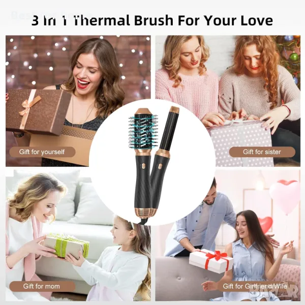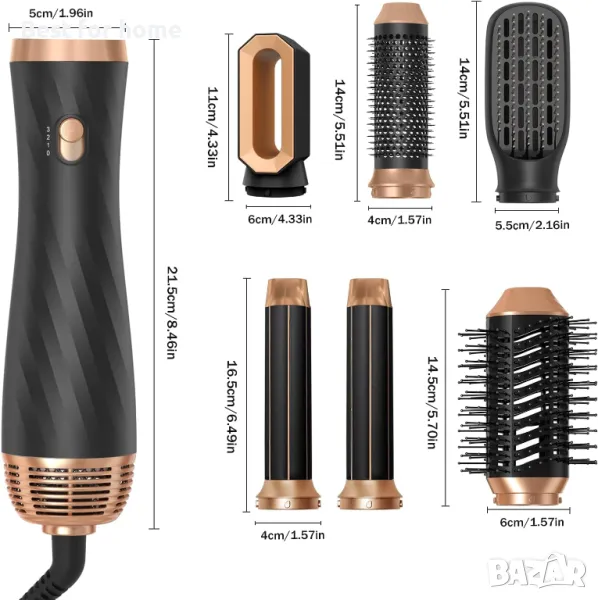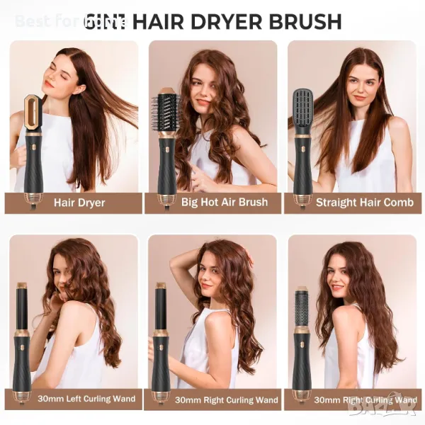 Нова надстройка 6 в 1 Четка за сешоар: Комплектът четки за сешоар за жени се предлага с 6 сменяеми приставки за четки, 1* глава за сешоар, 1* четка за преса за коса, 2* въздушна маша, 1* четка с горещ въздух за обем, 1* термо четка. Четка за сешоар Четка за сешоар в едно, тази четка за сешоар осигурява идеалното средство за създаване на различни прически за различни дължини на косата. Изящната опаковка също ви позволява да го използвате като подарък за приятели, семейство или някой друг, когото обичате.