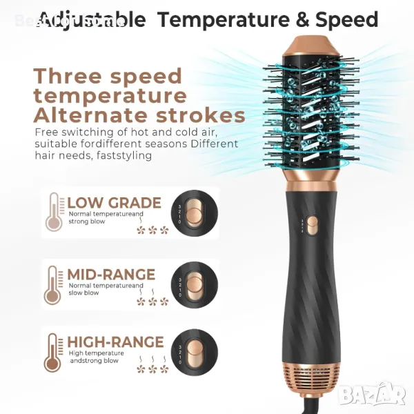 3 Температурна настройка 75°C- 130°F (167°F- 266°F): Четката на сешоара доставя 1000W мощност, можете да постигнете лесно и бързо нагряване; 3 температурни настройки за регулиране на топлината, четка за сешоар, подходяща за различни типове коса. 1: Ниска температура, за суха коса / фина коса, Подходяща за лятна употреба. 2: Средна температура, за полусуха коса / нормална коса, Подходяща за оформяне. 3: Висока температура, за мокра коса / гъста и къдрава коса, Подходяща за зимна употреба, суха коса бързо.