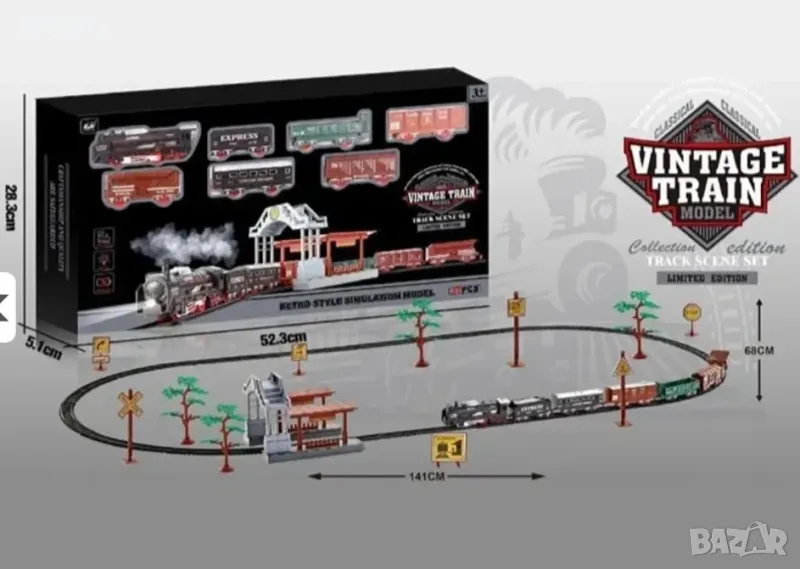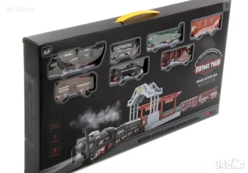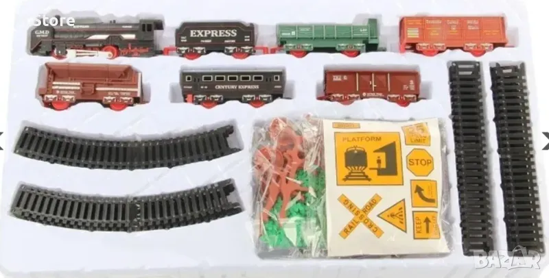 Комплектът с реалистичен дизайн, включва 36 елемента за сглобяване на железница, локомотив с колички, части за сглобяване на пътни знаци, комплект стикери напред фенерът свети.