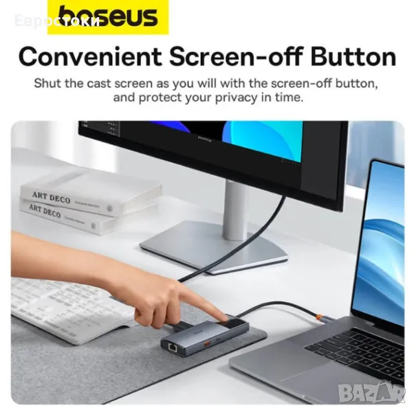Притеснения относно поверителността. Baseus Metal Gleam Series II е хъб, оборудван с функция за кастинг на екрана, която ви позволява да прехвърляте информация от един екран на друг. За да се гарантира сигурността на данните, устройството е оборудвано с бутон, който при натискане изключва екраните, без да се налага да изключвате хъба.