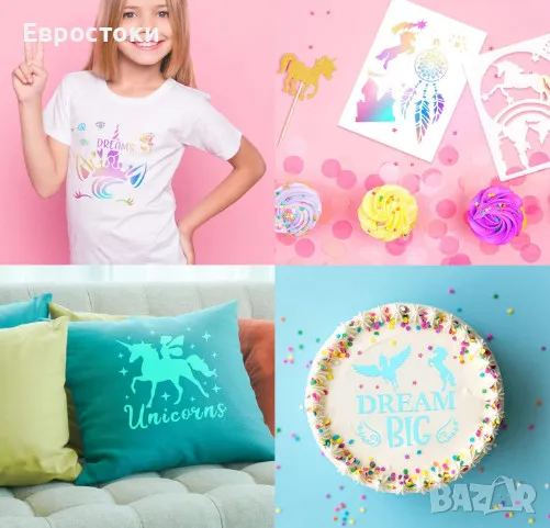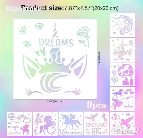 Комплектът включва 9 шаблона за рисуване с магическа тема - светът на Еднорозите. Използвайте въображението си, за да създадете своя невероятен дизайн!