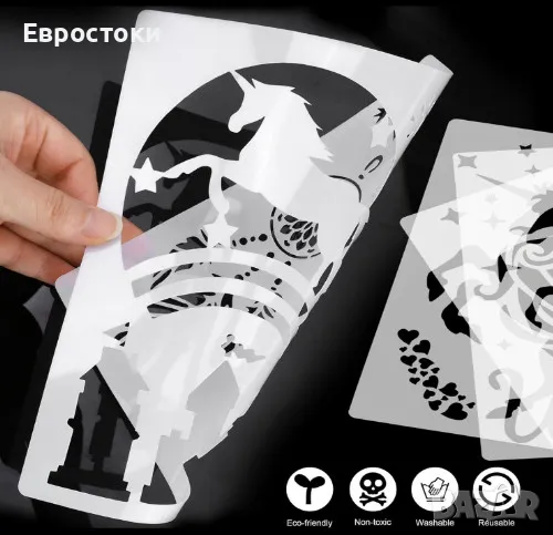 Шаблони за рисуване с еднорози са направени от PET материал, който е екологичен и безопасен. Те са за многократна употреба, издръжливи, миещи се и огъващи се. Лесно се мият със сапунена вода.
