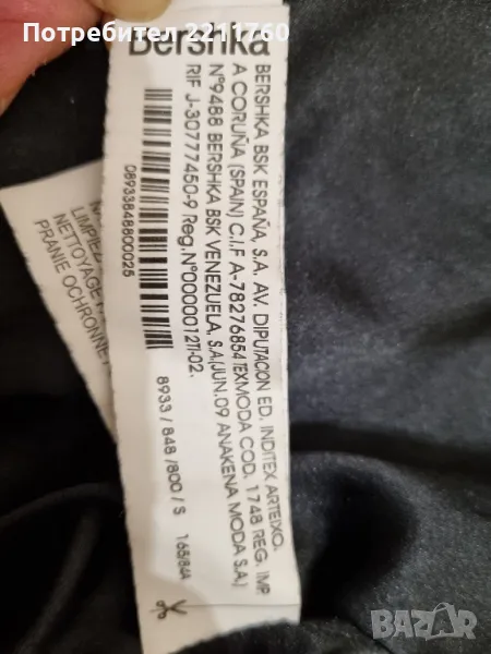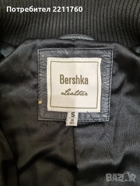 Яке от естествена кожа Berschka. Модела е с яка и маншети от плетиво. Подплатено с хастар. Естествена забележка е леко олющената емблема от вътрешната страна-тя е от изкуствена кожа. Размер S.