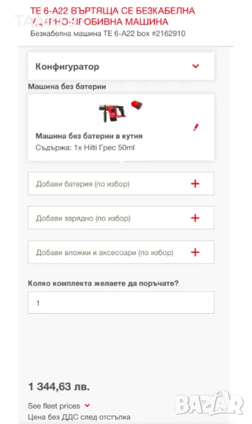 Продавам безчетков акумулаторен перфоратор на Хилти в отлично визуално състояние, както се вижда на снимките също така работи и функционира перфектно и без никакви забелеки, внос от Франция. Обявената цена е за само боди без батерии и зарядно. При желание на клиента може да се окомплектова с 2 батерии по 5.2Ah и бързо зарядно за 1000лв. Пращаме с опция преглед и тест с куриерска фирма еконт, може и лично предаване за гр. Шумен.