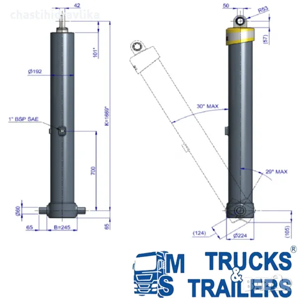 За монтирането на този Хидравличен цилиндър са необходими допълнителни елементи - горен комплект стойки и долен комплект стойки, които се заплащат отделно.