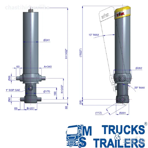 За монтирането на този Хидравличен цилиндър са необходими допълнителни елементи - горен комплект стойки и долен комплект стойки, които се заплащат отделно.