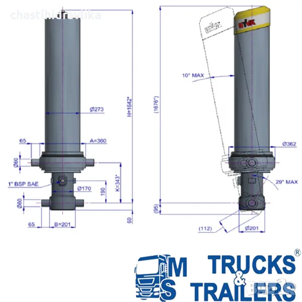 За монтирането на този Хидравличен цилиндър са необходими допълнителни елементи - горен комплект стойки и долен комплект стойки, които се заплащат отделно.