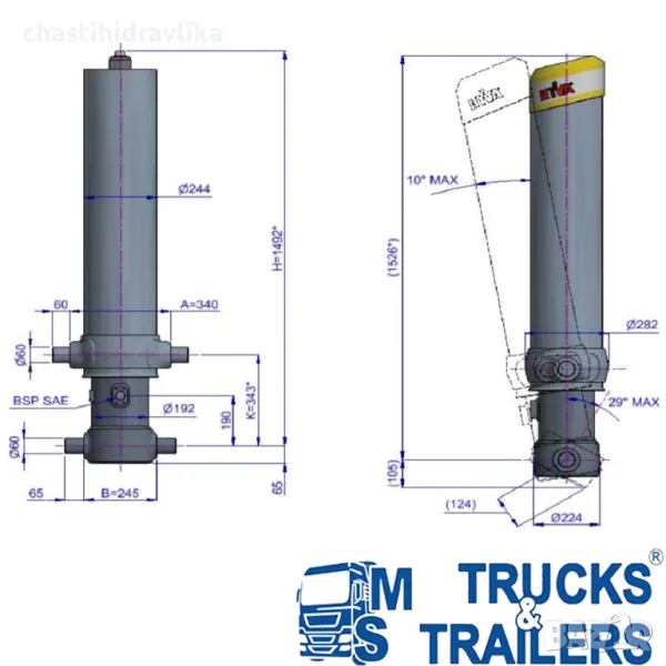 За монтирането на този Хидравличен цилиндър са необходими допълнителни елементи - горен комплект стойки и долен комплект стойки, които се заплащат отделно.