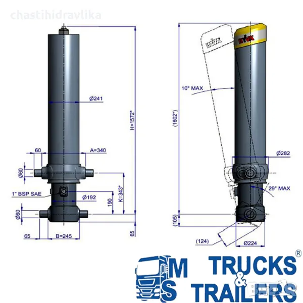 За монтирането на този Хидравличен цилиндър са необходими допълнителни елементи - горен комплект стойки и долен комплект стойки, които се заплащат отделно.