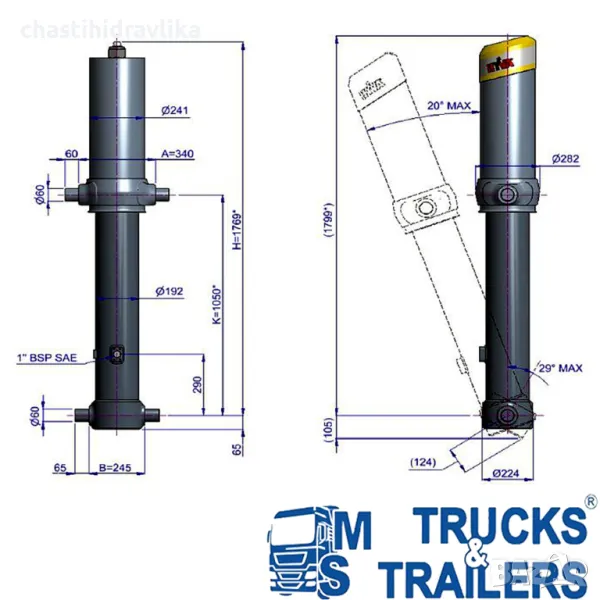 За монтирането на този Хидравличен цилиндър са необходими допълнителни елементи - горен комплект стойки и долен комплект стойки, които се заплащат отделно.