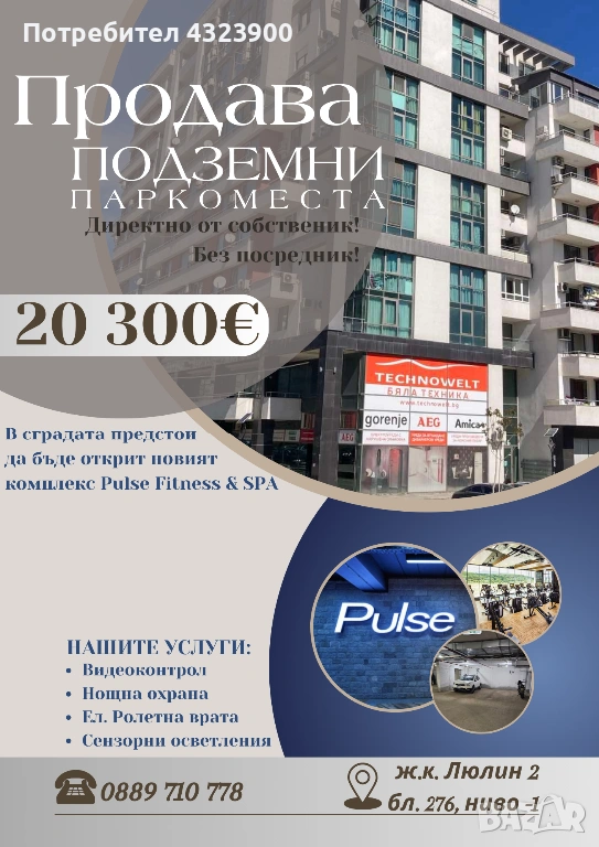 Продажба на подземни паркоместа директно от собственик! Без посредници и брокери! Цената е фиксирана! Възможен коментар при покупка на 3 и повече бр. едновременно! Паркоместата са предназначени за търговка дейност и не е необходимо да притежавате собственост в сградата! Достъп - ел. ролетна врата, видеоконтрол, нощна охрана, WC, вендинг машина за кафе, сензорно осветление, сервизни помещения, широки (6м.) улици.