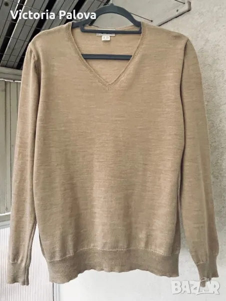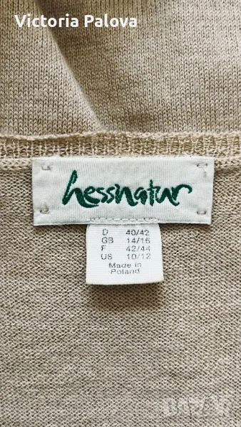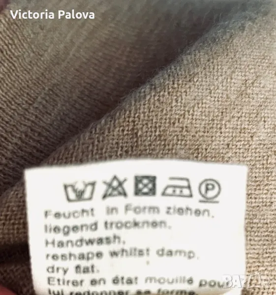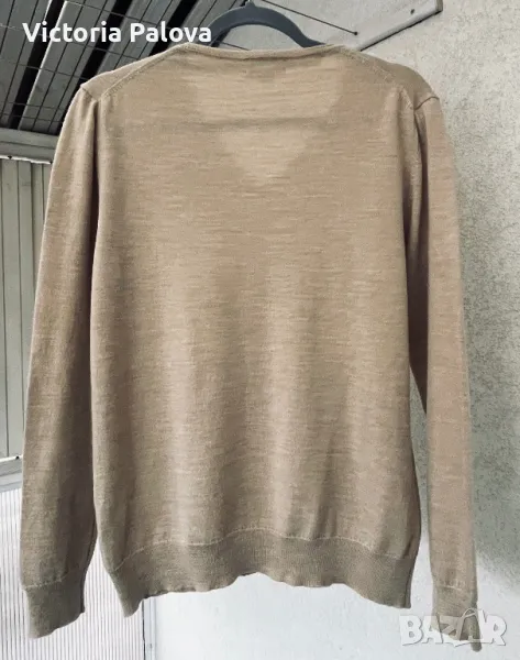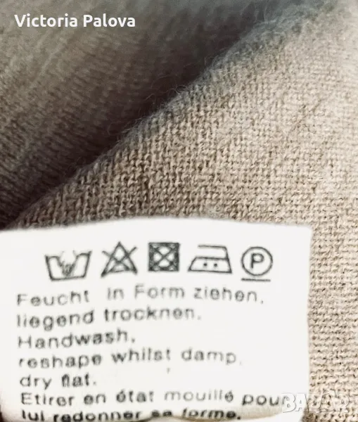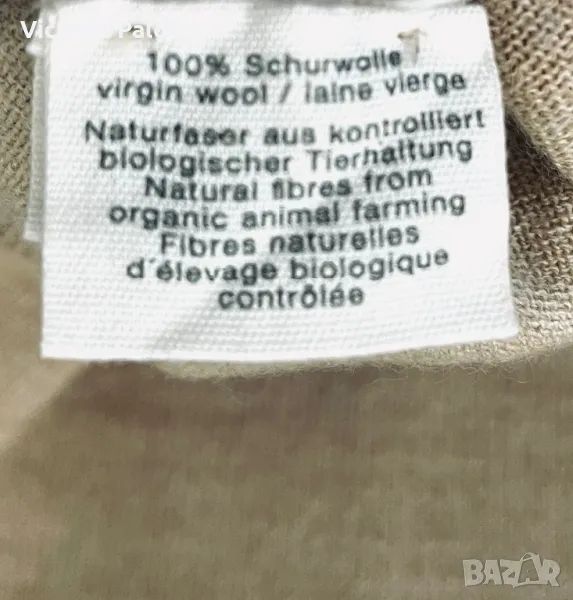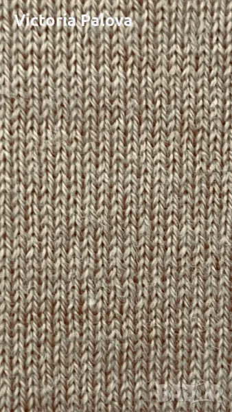 Материята на блузата е от биологични натурални влакна, на допир е като кашмир, топъл бежов цвят, недълбоко V деколте. Рамо - 42-44см, ГО - 52см, дължина - 66см, ръкав - 62см.