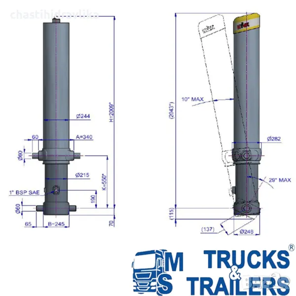 За монтирането на този Хидравличен цилиндър са необходими допълнителни елементи - горен комплект стойки и долен комплект стойки, които се заплащат отделно.