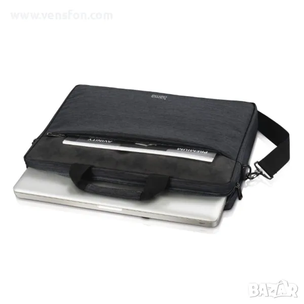 Елегантна чанта в тъмно сив цвят. Голям преден джоб за допълнителни лични вещи