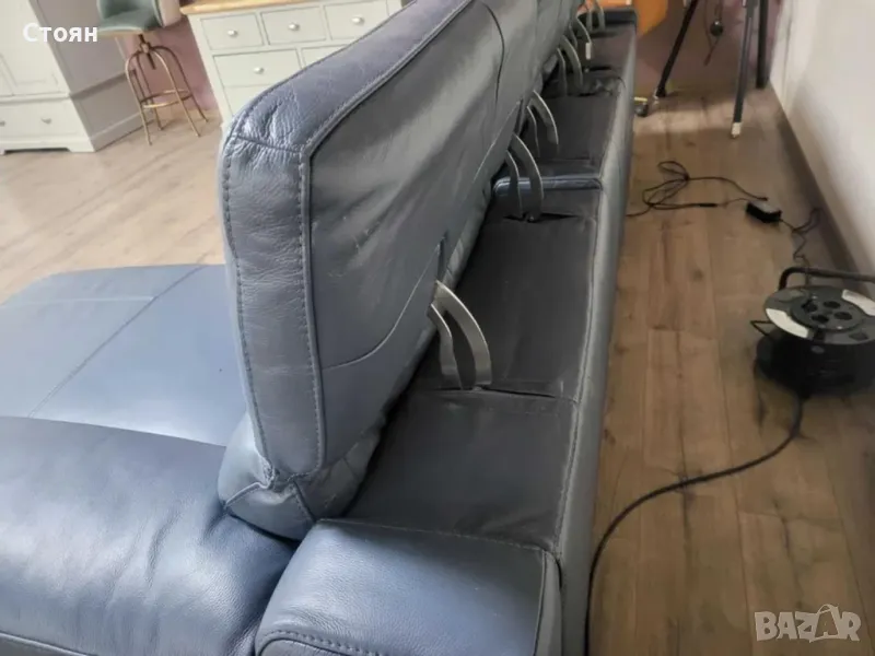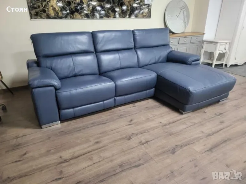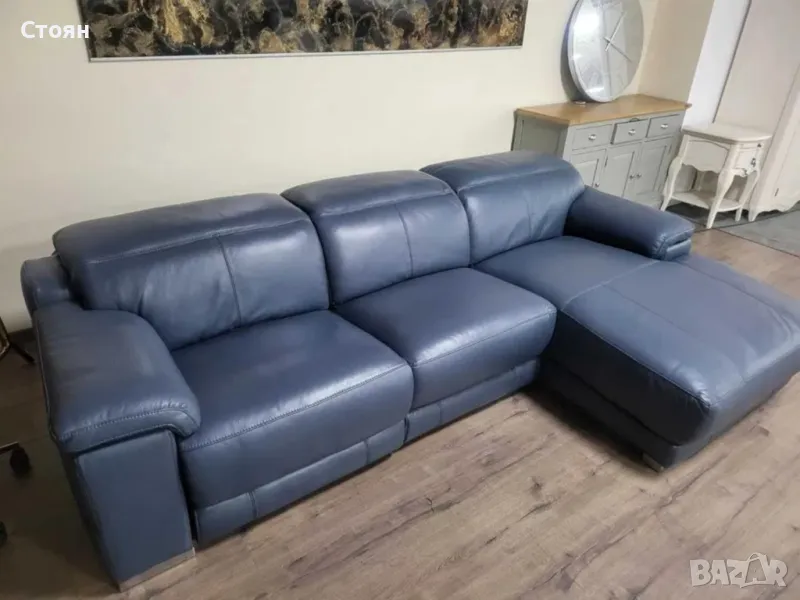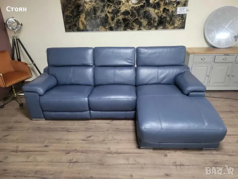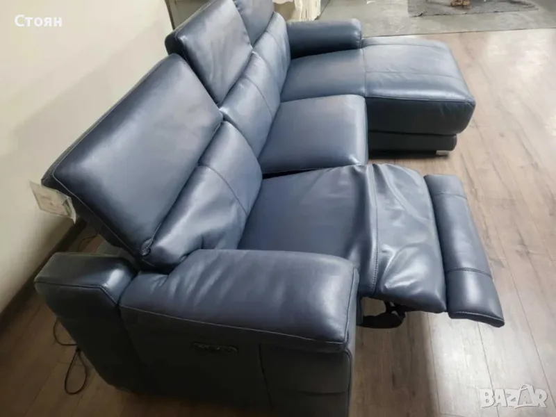 Син кожен ъглов диван Laurence с електрически релакс механизъм → Обява 48286610