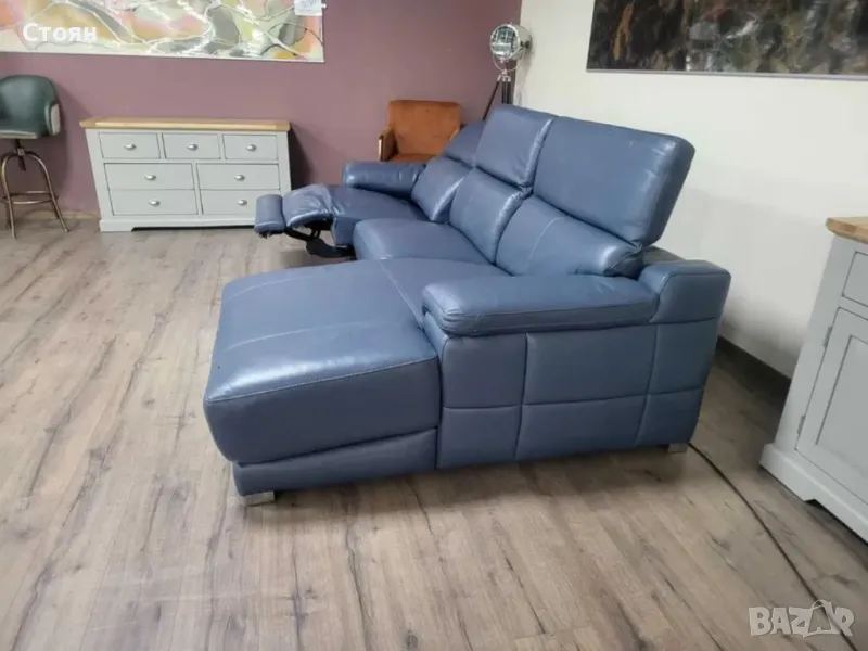 Син кожен ъглов диван Laurence с електрически релаксиращ механизъм за краката и облегалката на едната крайна седалка. Другите две облегалки също са подвижни и се управляват ръчно.