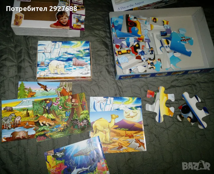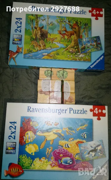 Снимка 11 и 12- картонени пъзели по 2 броя в кутия по 24 парчета, дървени кубчета 9 броя=20лв.