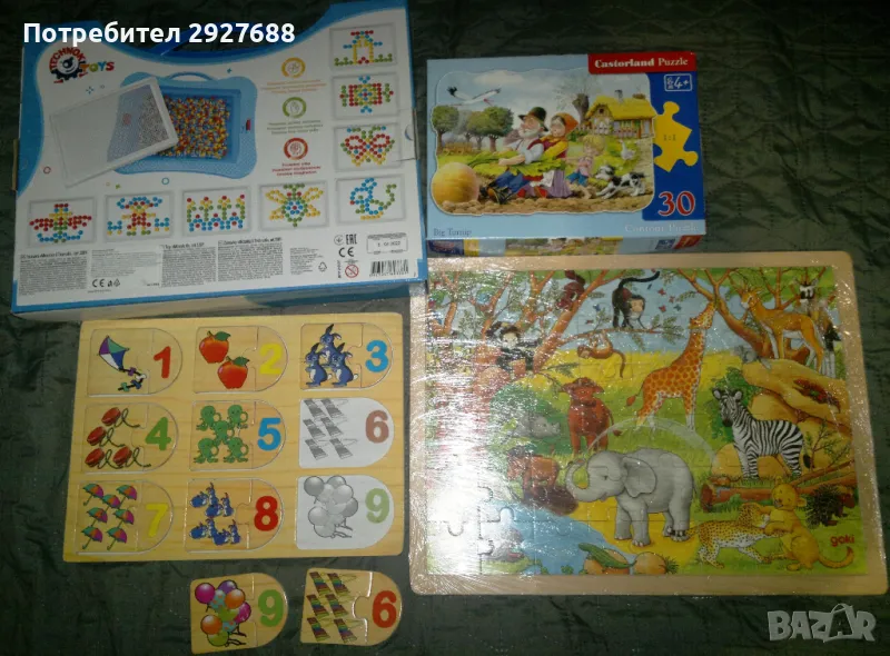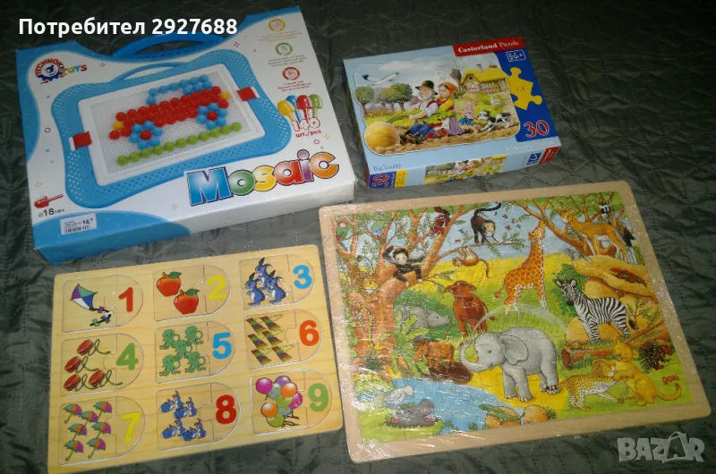 Снимка 3 и 4- мозайка, картонен пъзел 30 парчета, дървен пъзел Goki 48 парчета, дървен пъзел числа=25 лв.
