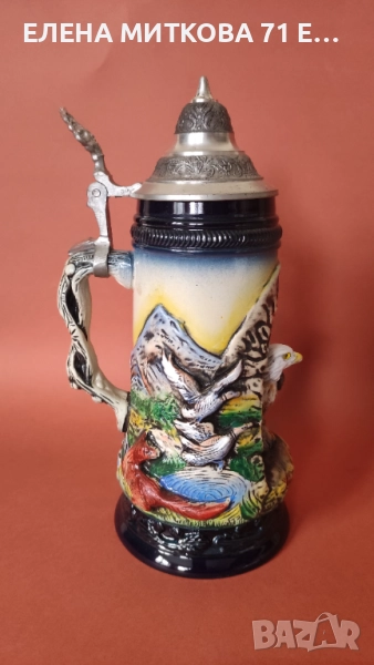 Уникална керамична халба с 3Д орел и релефни изображения на диви животни.С гравиран калаен капак.Ръчна изработка.Лимитирано издание.Прекрасна идея за подарък!
