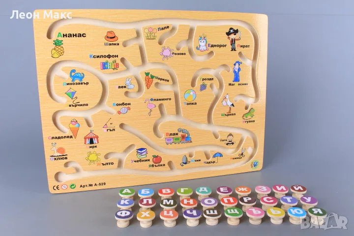 Дървен пъзел лабиринт с български букви, образователна игра → Обява 48288021