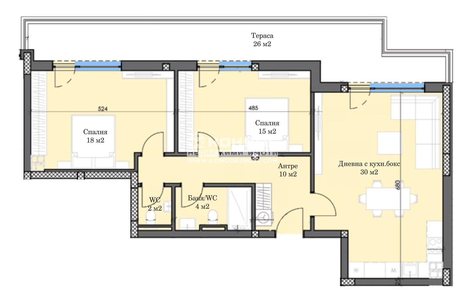 Оферта 65950: Предлагаме Ви възможността да закупите тристаен апартамент в новоизграждащ се луксозен жилищен комплекс с модерна визия, проектиран да създаде максимален комфорт на живущите в него. Функционално разположени жилищни секции с елегантен силует готов да предложи комфорт и модерен начин на живот. Едно от основните му предимства е страхотната локация, отлична комуникативност и динамична пътна инфраструктура, която осигурява бърз и лесен достъп до комплекса от всяка точка на града. Той съчетава лукс, спокойствие и комфорт с подсигурени паркоместа и гаражи. Жилището се състои от дневна /30 кв.м./ с кухненска част и трапезария, две самостоятелни спални 15 и 18 кв.м., баня с тоалетна, втора тоалетна, входно антре с място за перално и една панорамна тераса. Основната концепция при проектирането е да се постигнат просторни и функционални стаи, с цел да се създаде максимален уют на модерното семейство. Изключителна съвременна архитектура и модерна технология на строителство. Визията е иновативна, привличаща внимание с уникалността си. Всяко жилище ще разполага с пълно окабеляване за домофон, интернет и кабелна телевизия, общите части са луксозно завършени, жилищата са с алуминиева дограма с троен стъклопакет от най-висок клас, масивна блиндирана входна врата. За удобство на живущите съществува възможността да закупят подземни паркоместа и гаражи с топла връзка към комплекса. Гъвкави схеми на разсрочено плащане спрямо възможностите на клиента в рамките на строителството или закупуване чрез Банков Кредит, на изключително изгодни условия за клиенти на агенцията !!!