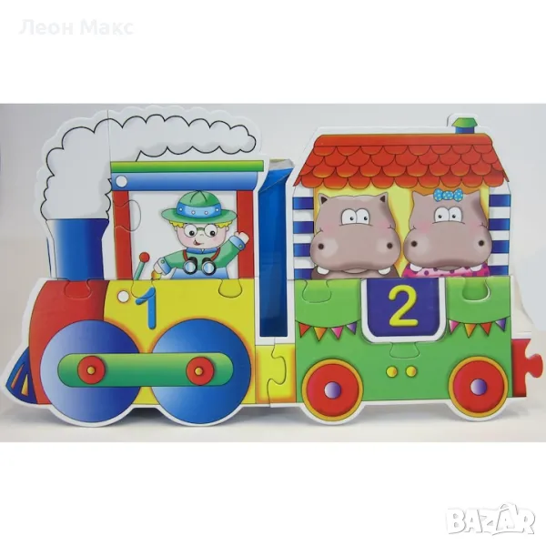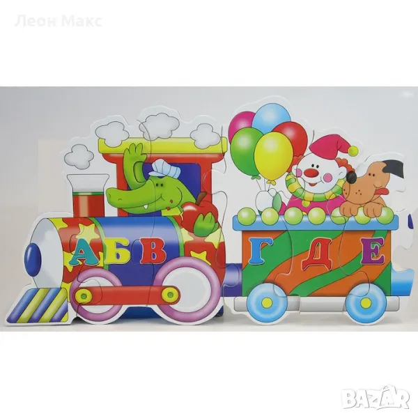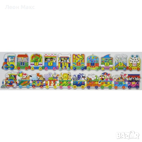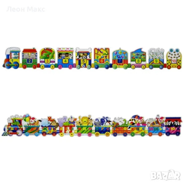 Комплектът съдържа 60 картонени елементи на два огромни влака-пъзели, единият с цифрите от 1 до 10, а другият с буквите от българската азбука.