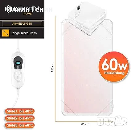 Размери: 150 см х 80 см (В х Ш). Мощност: 60 W. Степен на нагряване 1: 40 °C. Степен на нагряване 2: 45 °C. Степен на нагряване 3: 60 °C. Температурни зони: 1